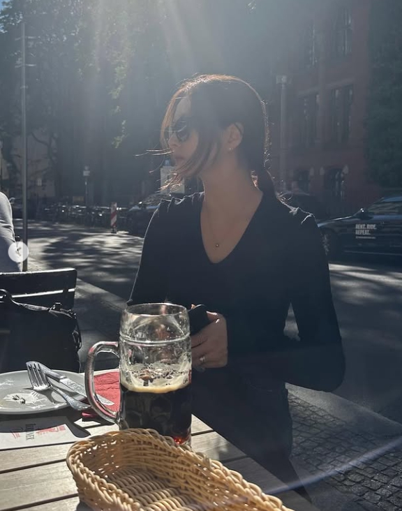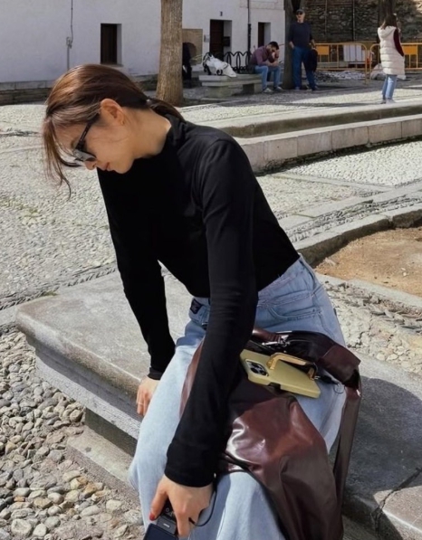 예를 들어, 밝은 연청 데님에 심플한 블랙 티셔츠를 매치한 사진이 있잖아요. 이 룩에서도 르메르 백이 보였고요. 또 다른 사진에서는 짙은 톤의 자켓을 걸치고 유럽의 건축물 앞에서 포즈를 취했는데, 여기서도 같은 가방이 눈에 띄었어요. 심지어 헐리한 헤어스타일로도 세련된 분위기를 유지할 수 있었던 건 확실히 이 가방 덕분이라고 생각했어요.