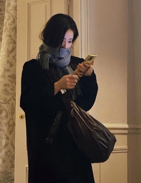한 번은 화이트 티셔츠에 검은색 팬츠, 그리고 가디건을 어깨에 나른스럽게 걸친 룩도 봤는데, 이 조합에서도 역시 같은 르메르 백이 어울리게 매치되어 있었어요. 정말 신기했던 건 여행 기간 내내 다른 가방을 단 한 번도 사용하지 않았다는 거예요. 이건 분명 의도적인 선택이 있었을 거라고 생각했죠.
