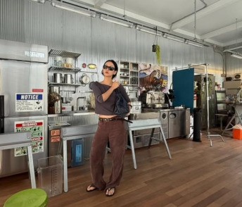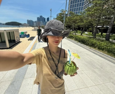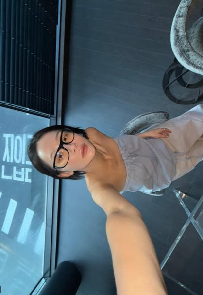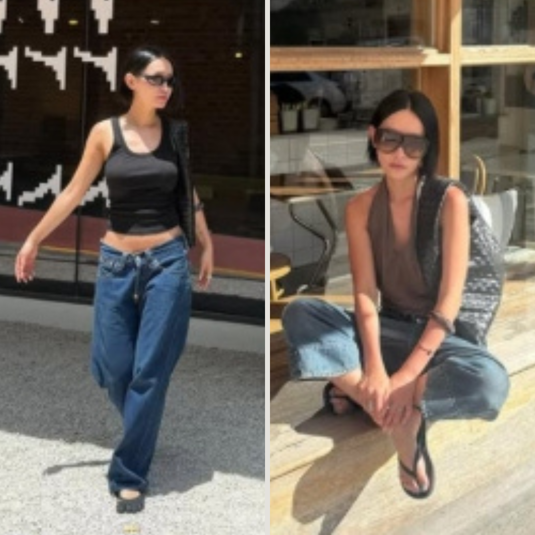 얼마 전에 올리신 사진 보셨어요? 브라운 홀터넥에 데님, 쪼리를 매치한 편안한 무드의 룩인데, 거기에 큰 선글라스 하나만 추가하셨는데도 완전 한 끗 다른 완성도를 보여주시더라고요. 이런 게 진짜 스타일링의 핵심인 것 같아요!