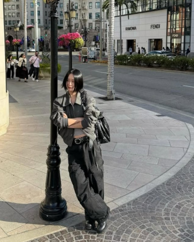 스터드 벨트, 볼드한 목걸이, 여러 팔찌를 레이어드하시는 액세서리 활용법도 정말 대단하세요. 미니멀보다는 존재감 확실한 큰 사이즈 선글라스나 가방으로 룩에 임팩트를 주시는 스타일링이 너무 멋있어요.