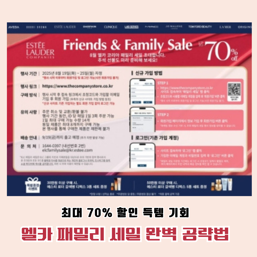 엘카 패밀리 세일(ELC Family Sale)은 **에스티 로더 컴퍼니즈(Estée Lauder Companies)**에서 정기적으로 진행하는 직원/가족 대상 할인 행사예요.